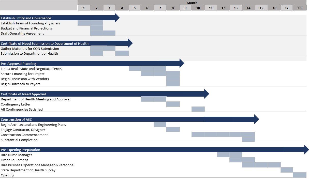 Below illustrates a development timeline to create a new Ambulatory Surgery Center in a state with a Certificate of Need Requirement